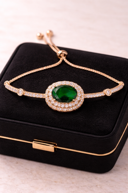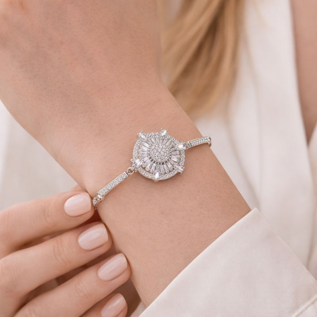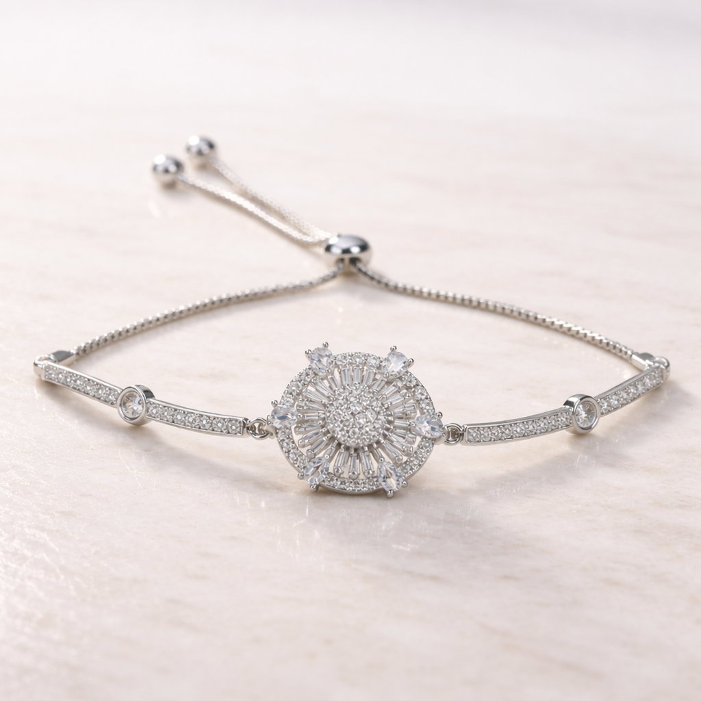 The sleek silver-tone adjustable slider chain ensures a perfect, graceful fit while enhancing the bracelet’s sophisticated appeal. Designed to elevate your look, this bracelet is ideal for weddings, formal gatherings, and special occasions where luxury makes a statement