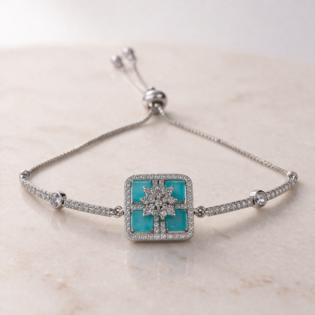 Make a bold yet elegant statement with our Luxury Square Halo Turquoise Zircon Bracelet, a premium piece designed to stand out on special occasions. Featuring a striking square centerpiece, this bracelet is adorned with vibrant turquoise-toned stones, beautifully framed by a halo of shimmering zircon crystals and finished with a radiant floral cluster at the center.