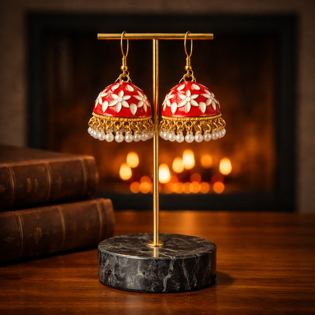 These beautiful Red floral jhumka earrings feature delicate white floral patterns with pearl drop detailing, creating a perfect blend of traditional charm and modern elegance.