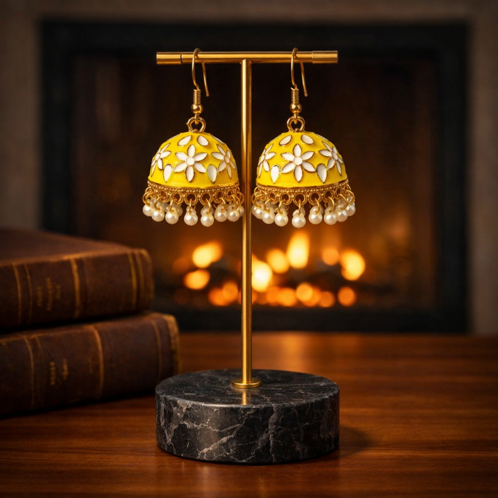 These beautiful Yellow floral jhumka earrings feature delicate white floral patterns with pearl drop detailing, creating a perfect blend of traditional charm and modern elegance.